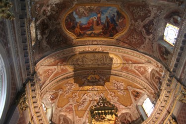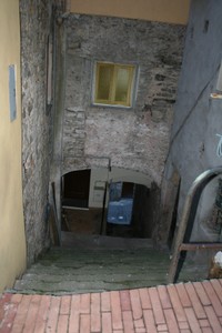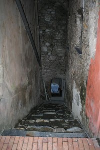 Gegenüber der Parkgarageneinfahrt führt eine schmale Gasse nach oben auf die Via Torino und man sieht links bereits die Kirche.